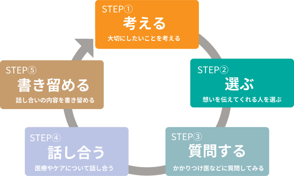 厚生労働省は、もしものときの医療やケアについて、本人が前もって考え、家族や医療・ケアチームと繰り返し話し合い共有する取組を「人生会議(ACP)」(下記図参照)として紹介しています。